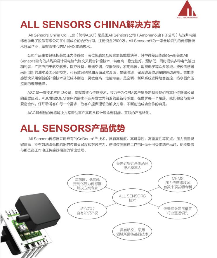 美國All Sensors (All Sensors Corporation.)是一家技術(shù)應(yīng)用型公司,是全球極少數(shù)掌握著核心傳感技術(shù)的公司之一。公司創(chuàng)始人Dennis是美國硅谷傳奇人物,于70年代在硅谷發(fā)明了全球第一顆壓力傳感器。30年來ALLSensors一直致力于為OEM客戶設(shè)計定制非常多經(jīng)典的傳感器,部分經(jīng)典產(chǎn)品并被業(yè)界某大公司收購并發(fā)揚(yáng)光大。 All Sensors掌握著世界領(lǐng)先的MEMS傳感器技術(shù),如獨(dú)有的CoBeam2 TM傳感器技術(shù)等。